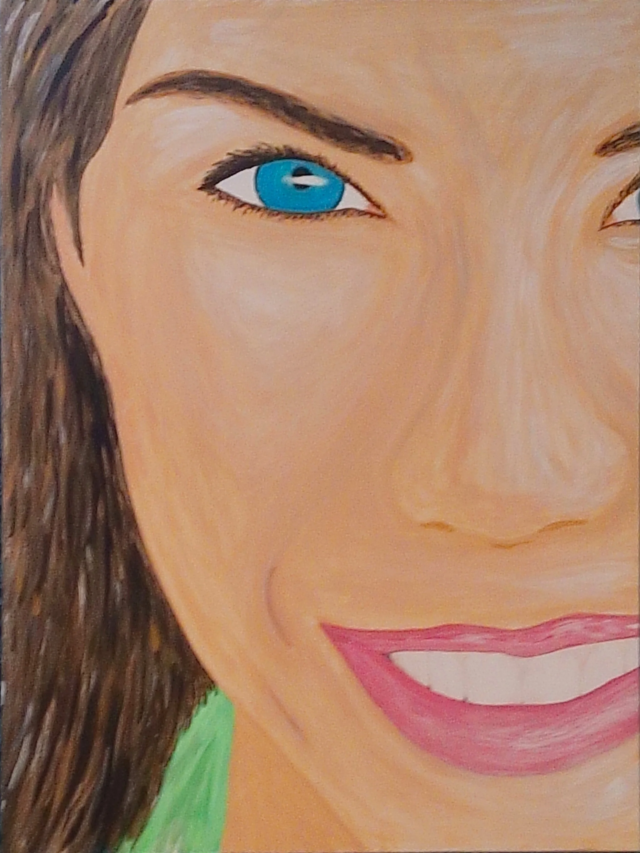 "T-Rex" is a 40" x 30" acrylic portrait by Todd Baker, a bold close-up of his wife, Barby. The canvas magnifies her brilliant blue eyes, radiant smile, and expressive features, filling the frame with both intimacy and intensity.