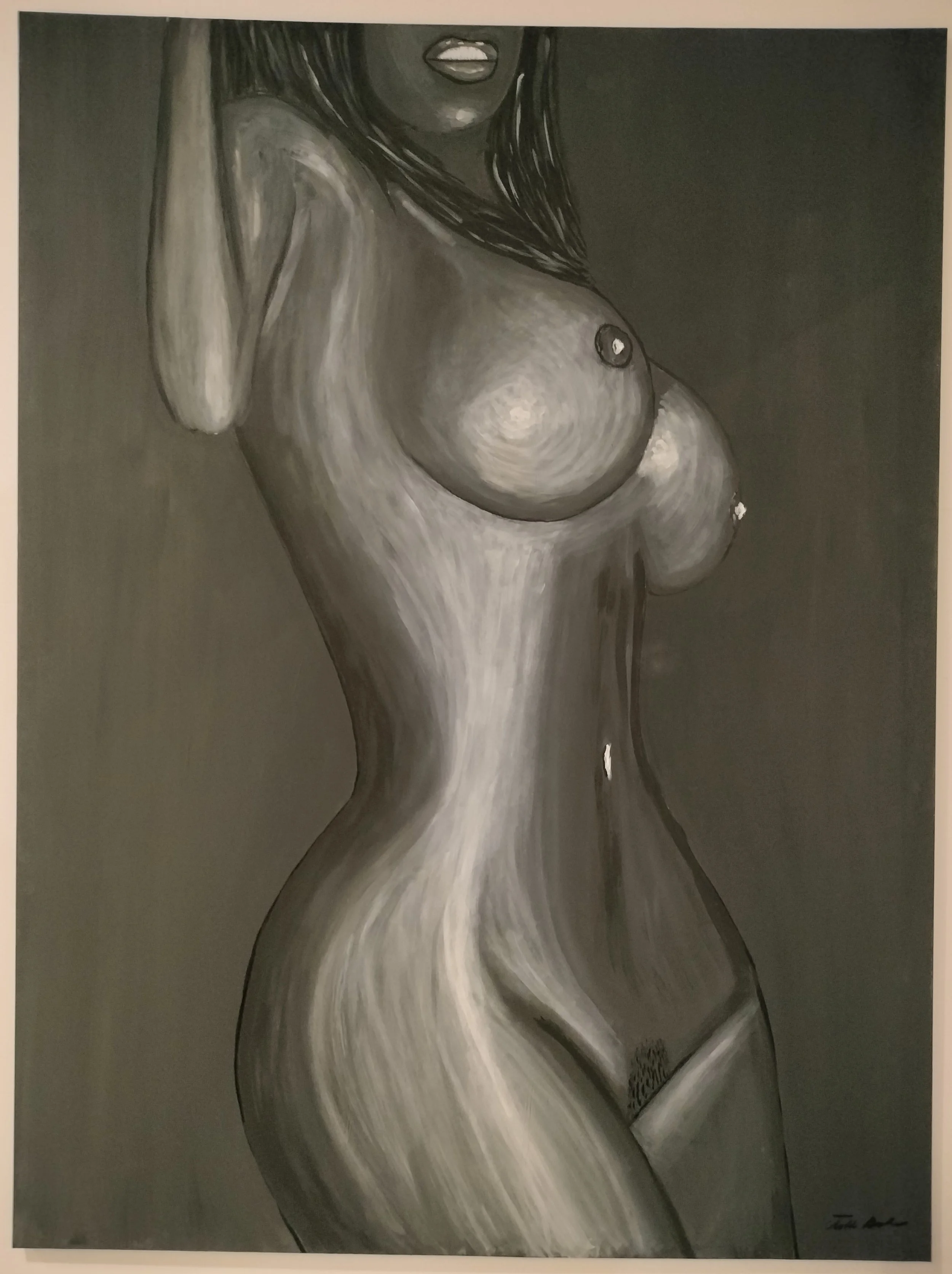 Original acrylic on 48” x 36” stretched canvas without frame.“All That” is a bold celebration of form, confidence, and movement, painted exclusively in black and white acrylic. This striking canvas transforms simplicity into power, with every curve emphasized by dramatic contrasts of light and shadow. The limited palette draws the viewer into pure composition and emotion, where elegance meets strength and the figure emerges as both abstract and sensual—timeless yet modern. A statement work in every sense, All That is more than a painting—it is beauty distilled to its essence. Contact directly for purchase or questions about originals. Prints also available in Shop