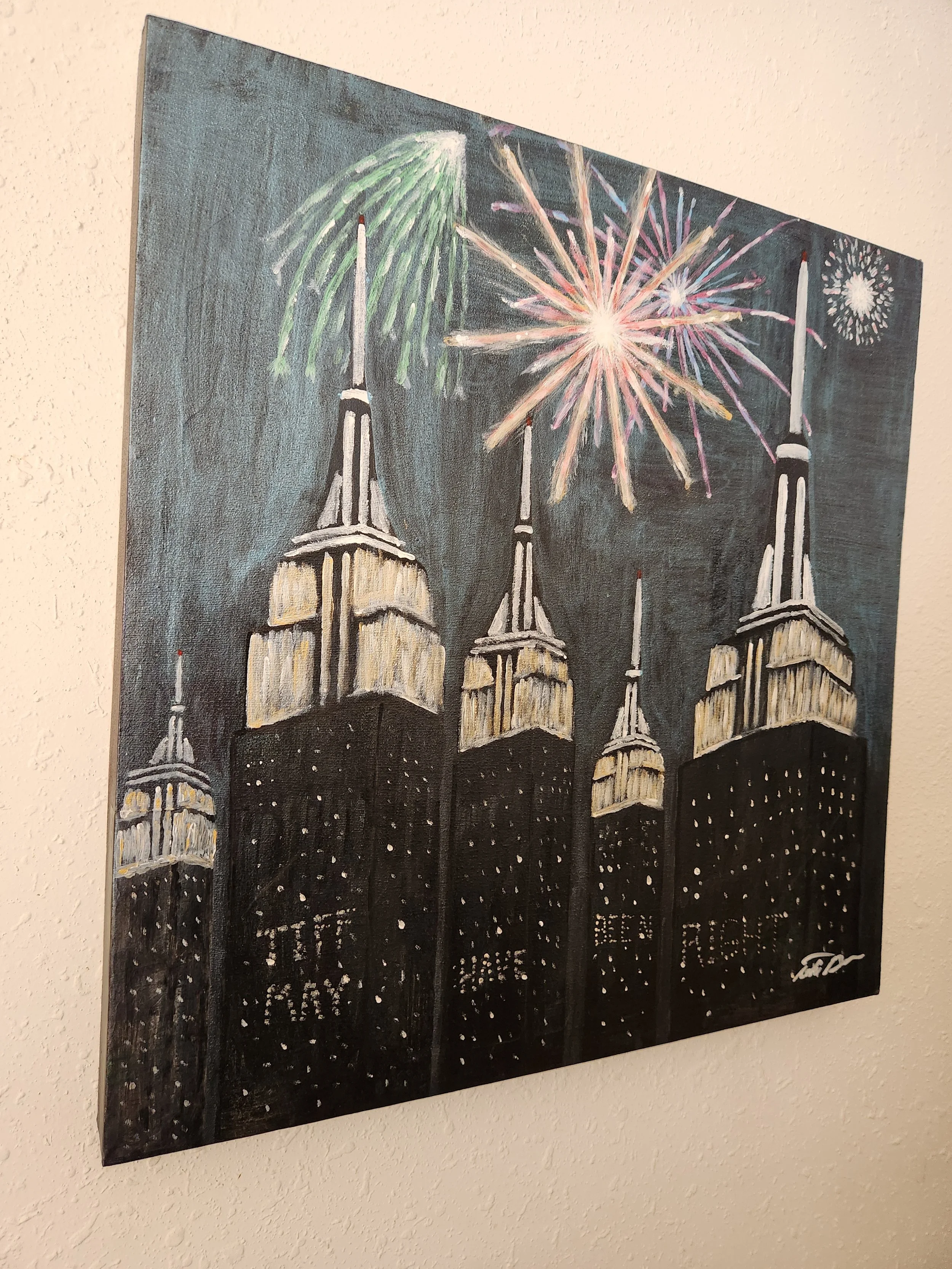 "EmpireS" by Todd Baker is a 20" x 20" acrylic on canvas, born from a playful bet in New York City. While visiting Lower Manhattan with his wife Barby and their friend Tiffany, Baker claimed he could see the top of the Empire State Building from miles away — a point Tiffany strongly disputed. To commemorate the wager, Baker embedded a painted dollar bill into the first building on the left, while weaving the phrase “Tiff may have been right” into the illuminated windows of the four central towers.