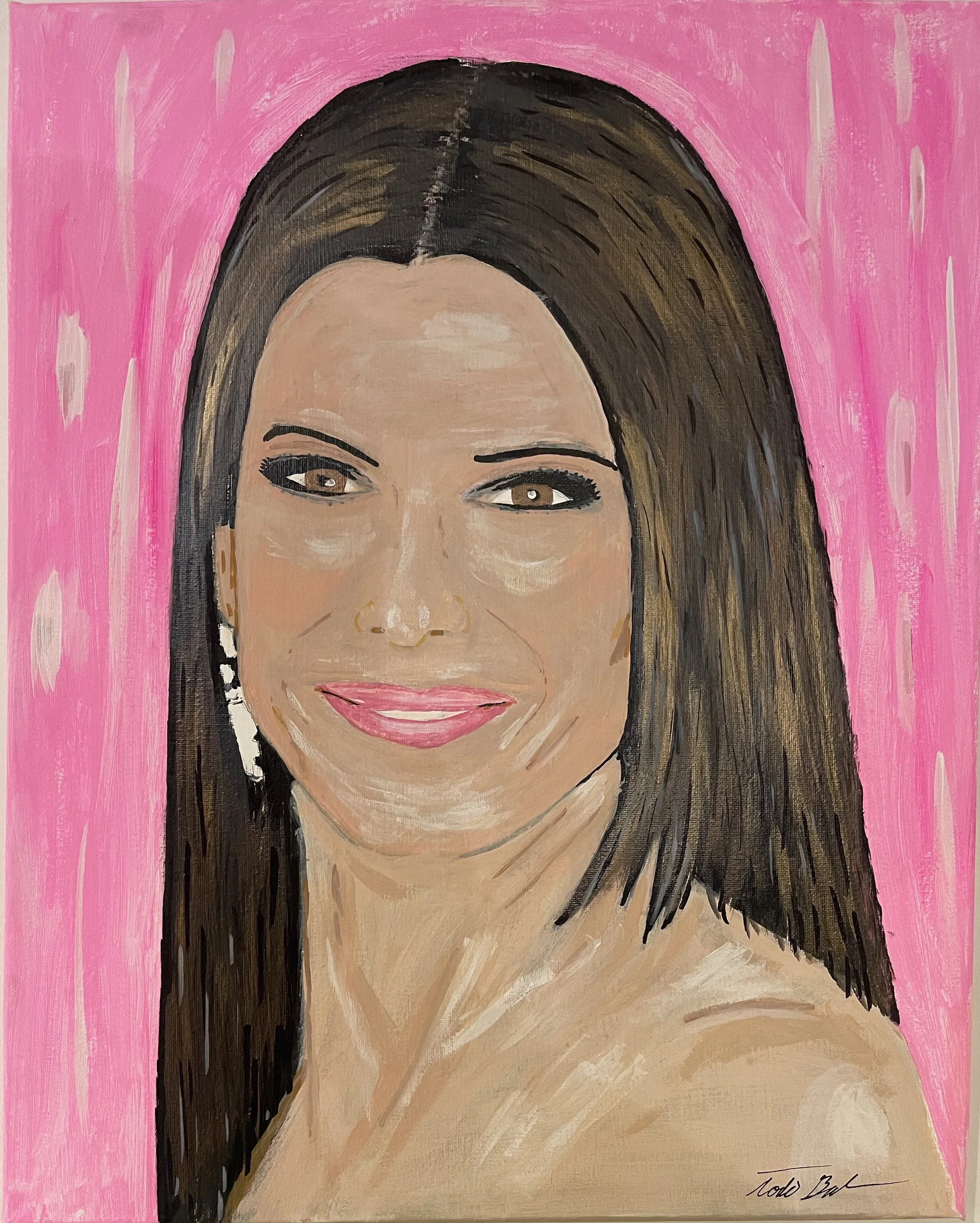 "Sleek Sandra" by Todd Baker is a refined 20" x 16" acrylic portrait on stretched canvas, honoring the elegance and charisma of Sandra Bullock. Set against a radiant pink background, her timeless beauty is captured through smooth brushwork, delicate skin tones, and expressive eyes that reflect warmth and strength. The composition balances simplicity and sophistication, allowing the star’s presence to command the canvas without distraction. Both modern and classic, Sleek Sandra embodies Hollywood glamour while celebrating individuality, making it a captivating piece for collectors and admirers alike.. Contact directly for purchase or questions about originals. Prints also available in Shop
